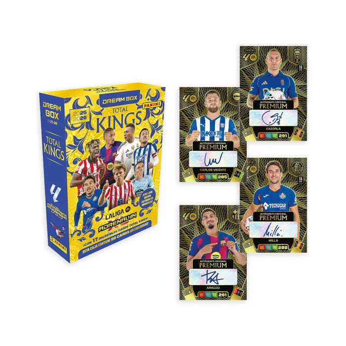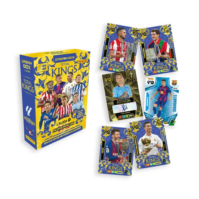 La DREAM BOX “TOTAL KINGS” de la magnífica colección de Trading Cards Adrenalyn XL LaLiga EA Sports 2025-26 es una auténtica pieza de coleccionista, de tirada limitada, que te permite obtener muchas cards espectaculares de la colección.