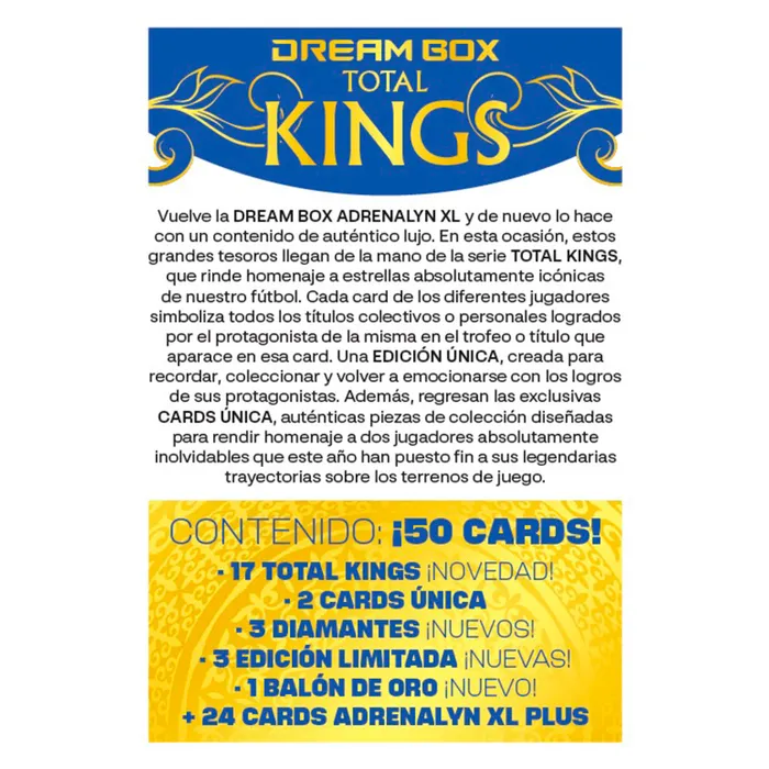 Vuelve la DREAM BOX Adrenalyn XL y de nuevo lo hace con un contenido de auténtico lujo. En esta ocasión, estos grandes tesoros llegan de la mano de la serie TOTAL KINGS, que rinde homenaje a estrellas absolutamente icónicas de nuestro fútbol. Cada card de los diferentes jugadores simboliza todos los títulos colectivos o personales logrados por el protagonista de la misma en el trofeo o título que aparece en esa card. Una EDICIÓN ÚNICA, creada para recordar, coleccionar y volver a emocionarse con los logros de sus protagonistas. Además, las exclusivas CARDS ÚNICAS, auténticas piezas de colección diseñadas para rendir homenaje a dos jugadores inolvidables que este año han puesto fin a sus legendarias trayectorias sobre los terrenos de juego.